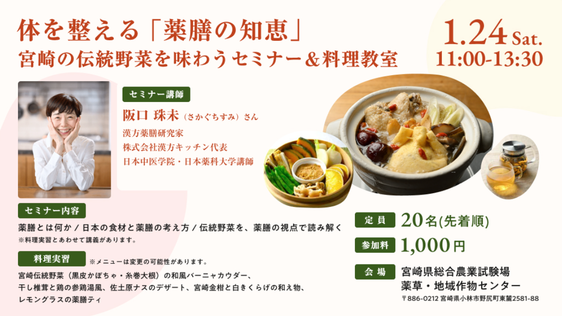 | イベント名 | 宮崎の伝統野菜をもっとおいしく、もっと健やかに― 体を整える「薬膳の知恵」と宮崎の伝統野菜を味わうセミナー&料理教室 ― |