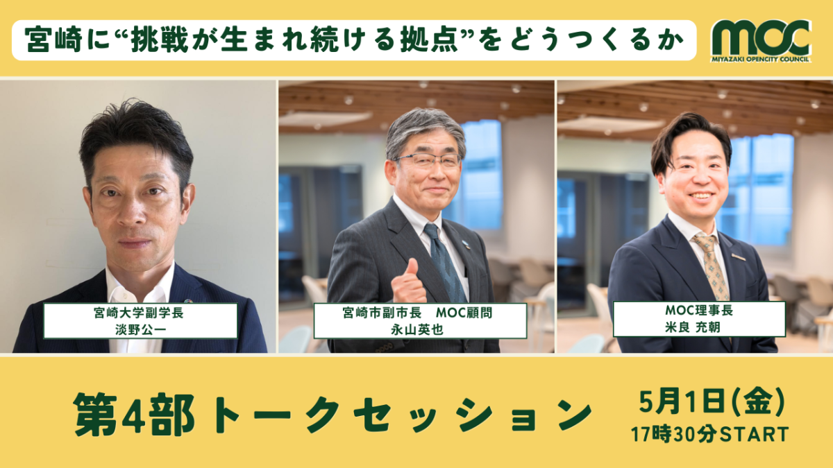 登壇:宮崎大学副学長 淡野公一氏× 宮崎市副市長・MOC顧問 永山英也氏 × MOC理事長 米良充朝氏