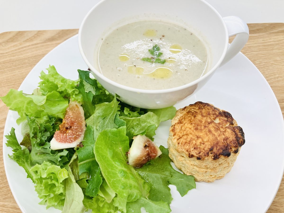 開始からの提供が可能となったことで、まいろの後藤さんにもセミナーにご参加いただき参加者とより近い形で会話を楽しまれていました。今回は、無花果のサラダ(手作りドレッシング付)、全粒粉スコーン、しいたけのポタージュをワンプレートでアツアツのうちにご提供いただきました。調味料は植物性のみを使用し、味付けは塩麹、甘酒などを使用した本当にシンプルな味付けとのことでしたが食べていく毎に素材本来の甘味や奥深さを感じられ身体にじんわりと染み渡るような心地よいひと時となりました。