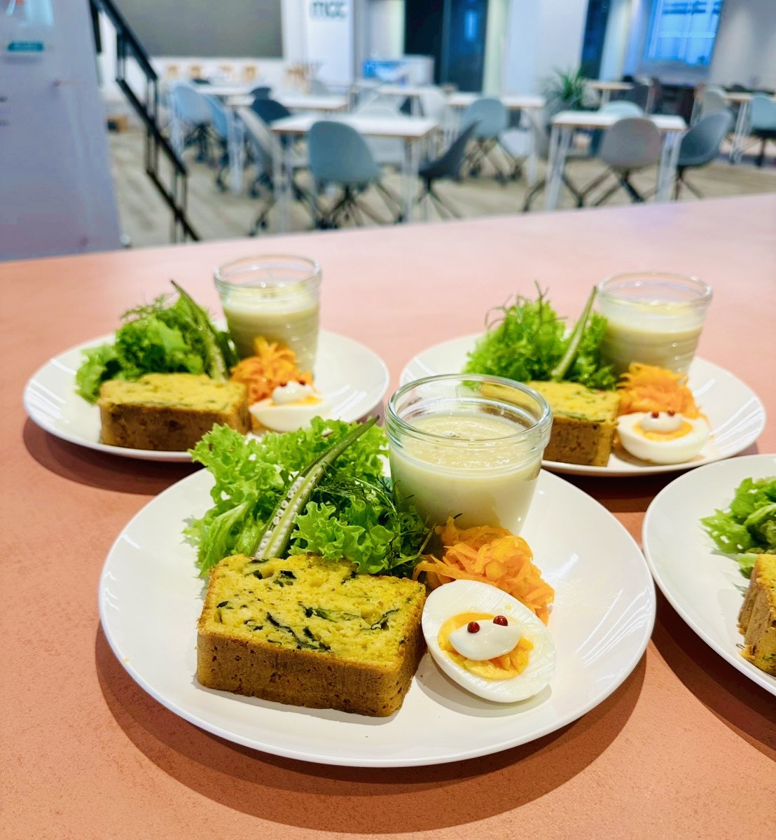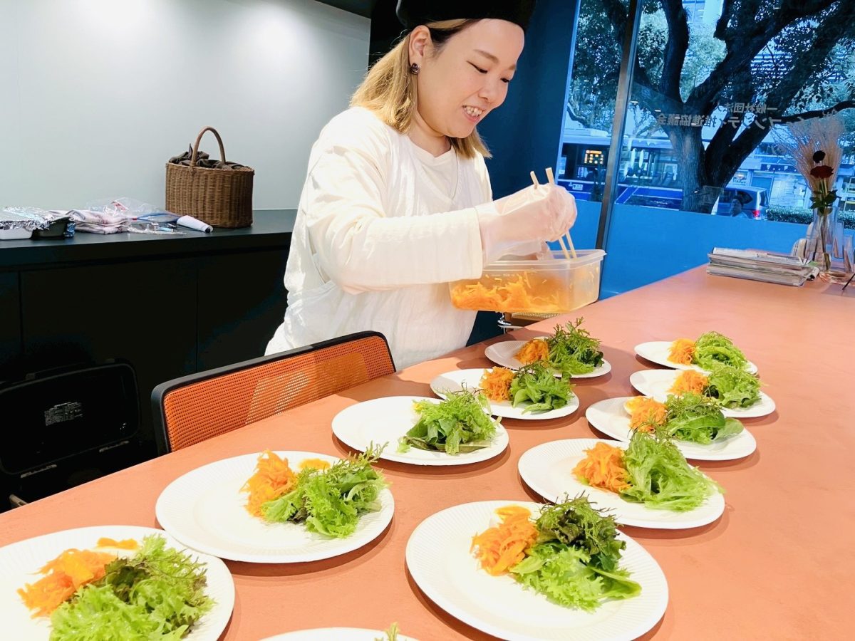 今回は、サツマイモのポタージュ、柿と人参のラぺ、自家製ソイマヨのせのゆで卵、野菜のケーキサレという秋尽くしのボリュームたっぷりワンプレート。塩麹、甘酒などを使用した本当にシンプルな味付けということでしたが、意外な素材の組み合わせと素材本来の甘さ、味の奥深さに参加者も興味津々に質問をされていました。