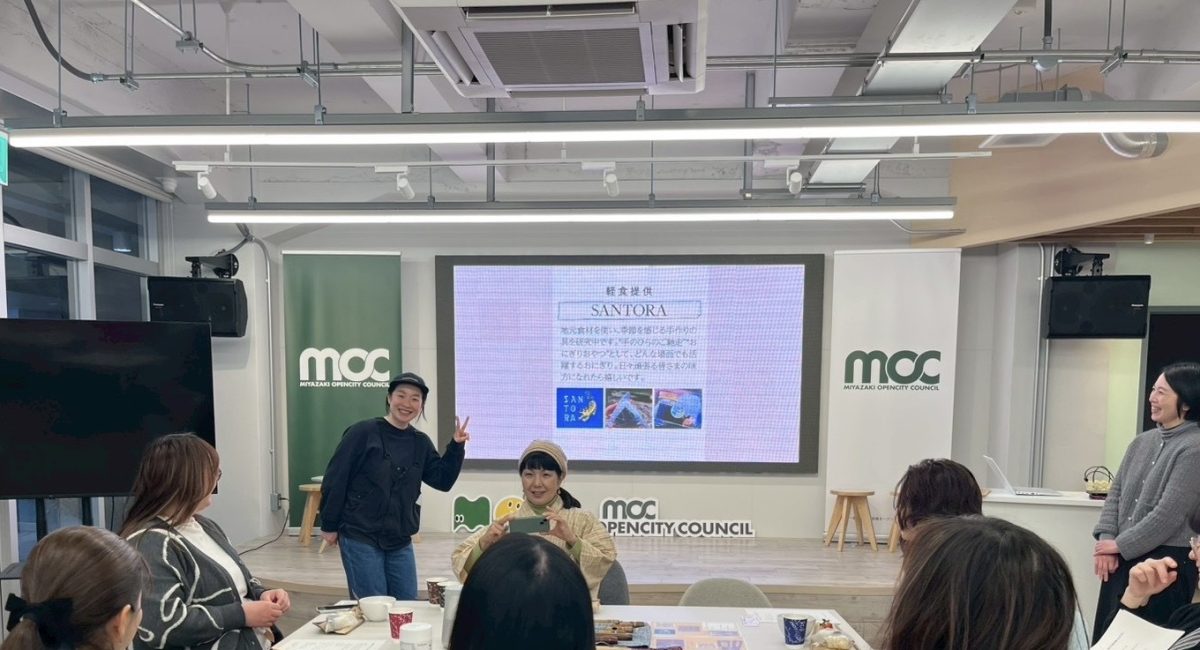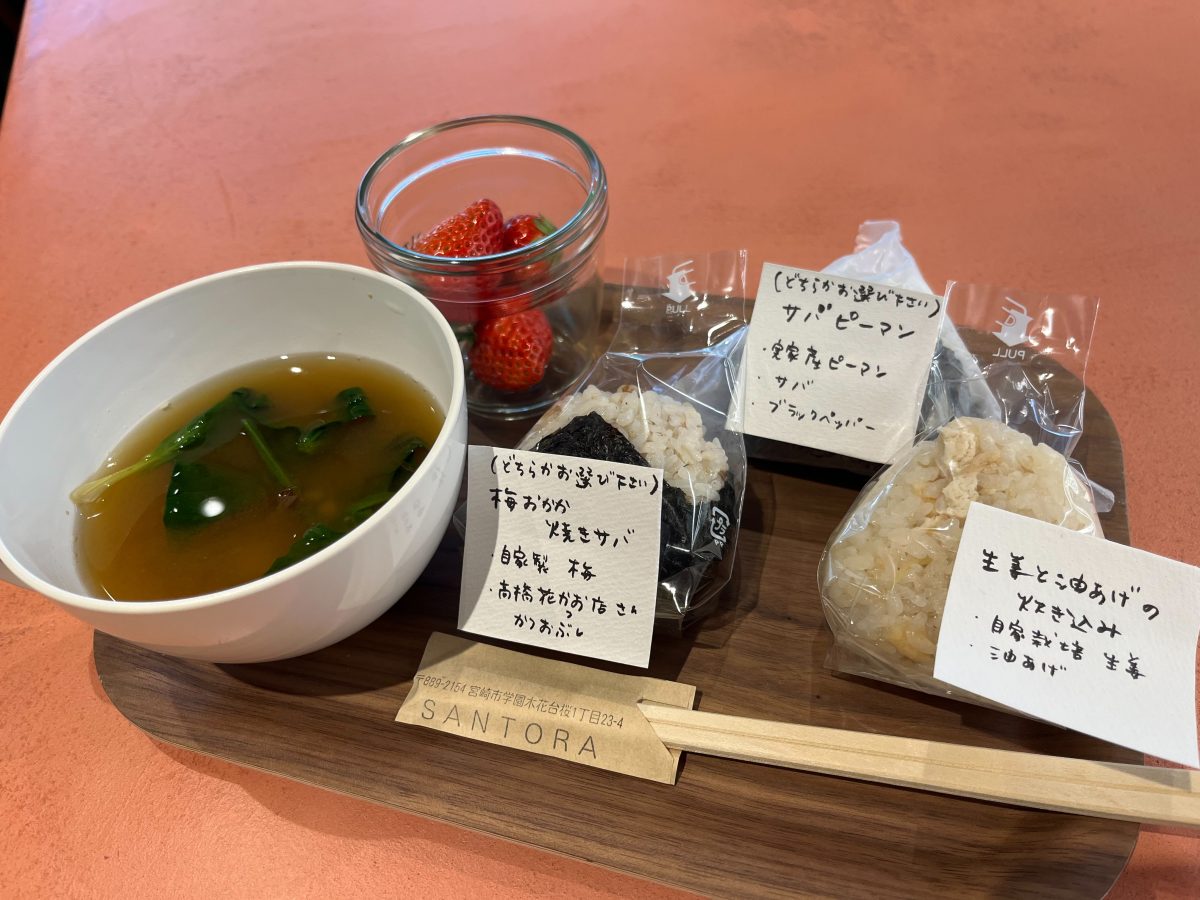 セミナー終了後には、宮崎市木花でおにぎりと南アフリカのワインを取り扱うSANTORAの下津佐さんにお越しいただき朝食を囲んだ交流会が行われました。SANTORAは3匹の虎がモチーフになっています。3匹の虎(三寅)が一説では大変縁起が良いということ、ご夫婦が寅年生まれということで屋号にされたとのことでした。ご実家が農家で、そこで収穫された季節のお野菜や農産物をおにぎりやその具材、またお惣菜として使われています。