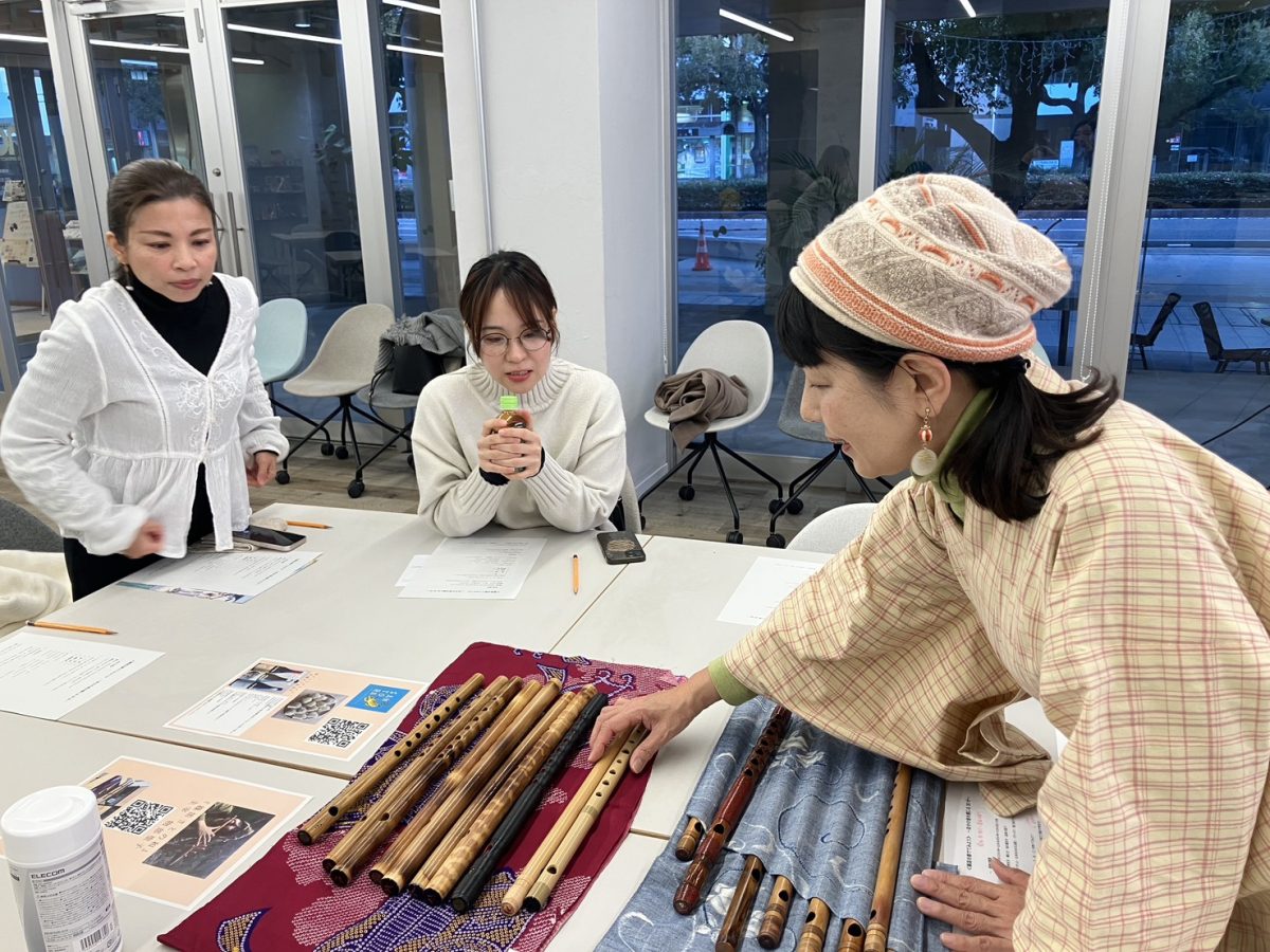 ワークショップの締めくくりには、特別な瞑想タイムが設けられました。 参加者は目を閉じ、静かな気持ちで鳥のさえずりなどの音に耳を傾けます。講師の合図に合わせて、それぞれが自分の好きな音を自由に吹いていくと最初はバラバラだった音が、不思議と一つのハーモニーのようにまとまっていき、「森の中にいるような体験」が会場を包み込みました。参加者からは「最初はドキドキしたけれど、最後は音が一つにまとまっていく素敵な時間だった」との感想が寄せられました。