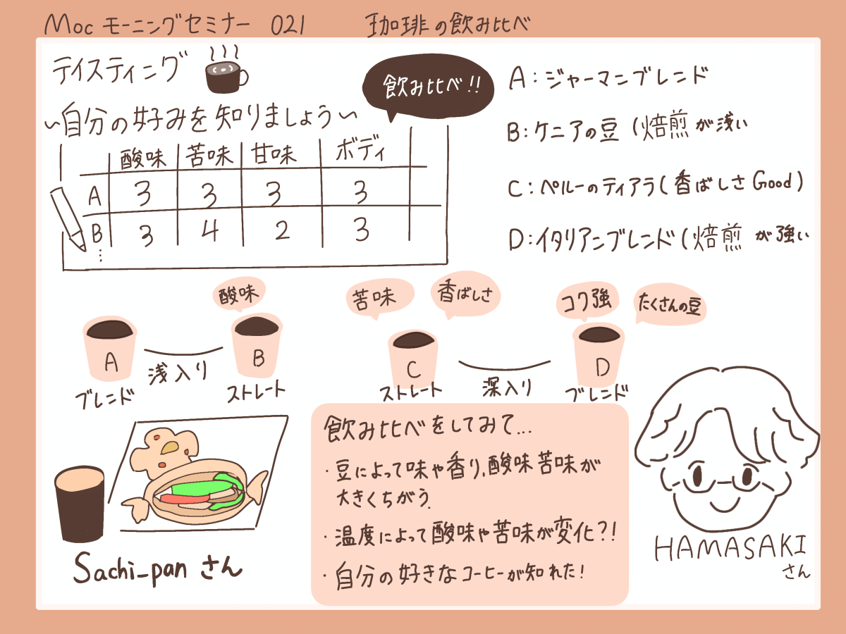 今回も宮崎大学教育学部の川畑さんに、セミナーの様子をグラフィックレコーディングしていただきました。 豆ごとの個性の違いや、温度による味の変化、そして自分の好みを見つけていくプロセスが、温かみのあるイラストで分かりやすく可視化されました。参加者からは「後で見返した時に内容がスッと入ってくる」「とても分かりやすい」と好評でした。