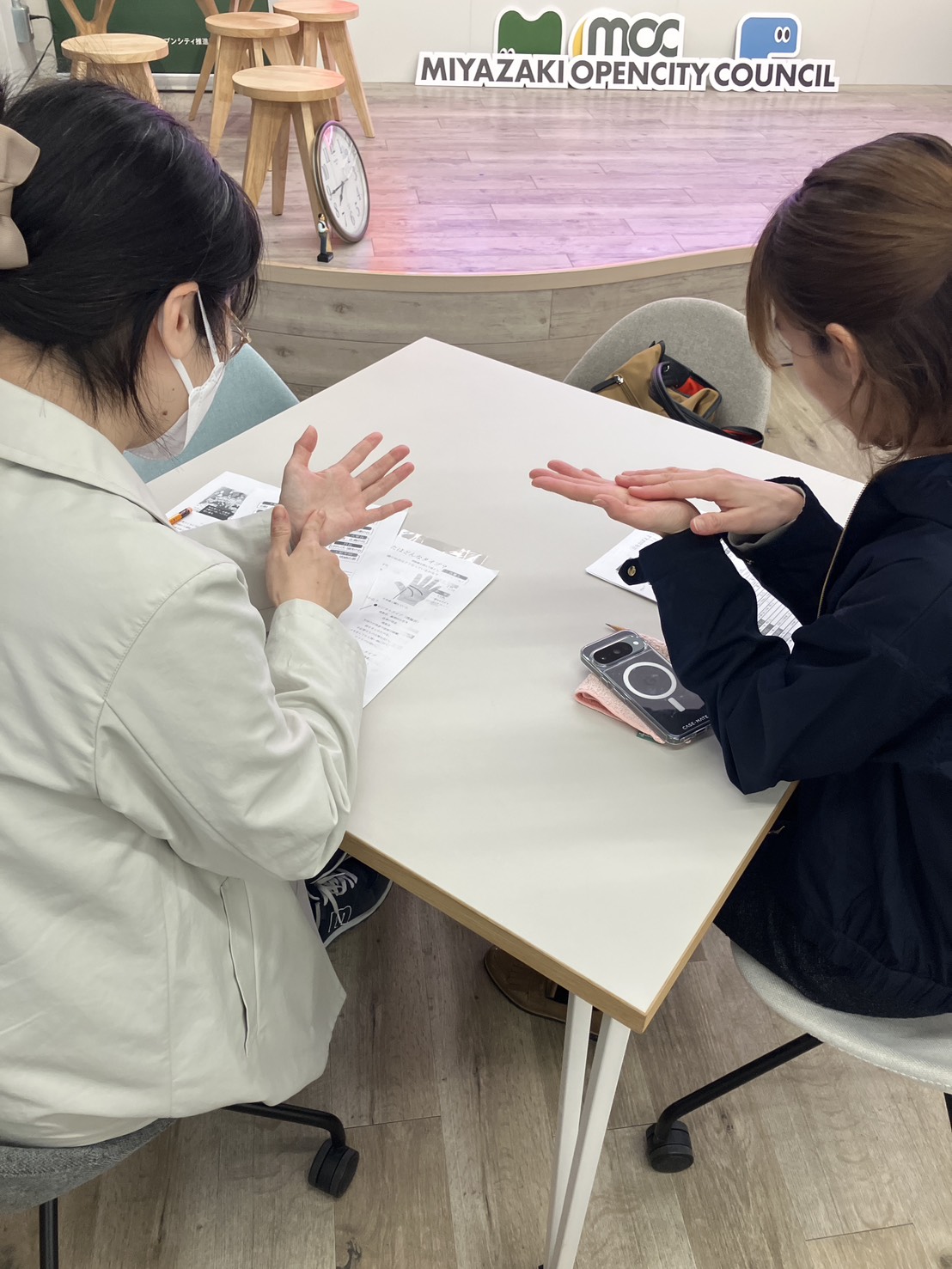 今回は2人1組となり、手の形がどこに分類されるのか手相がどのような線が表れているのかを確認していきました。手の平や長さなど詳細に見る機会はないため、ここまで人それぞれに違いがあることを